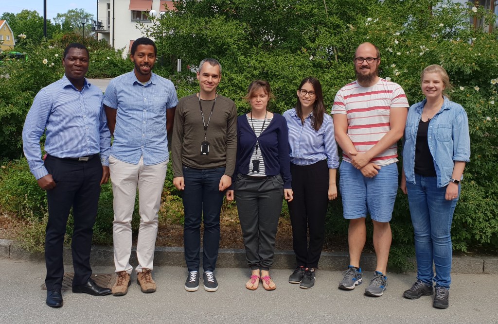From left to right: Ezekia Mtetwa (Postdoc), Cesar Fortes-Lima (Postdoc), Mario Vicente (PhD student), Cecile Jolly (Research Engineer), Jessica De Loma Olsson (PhD student), Rickard Hammaren (PhD student), Carina Schlebusch (PI)