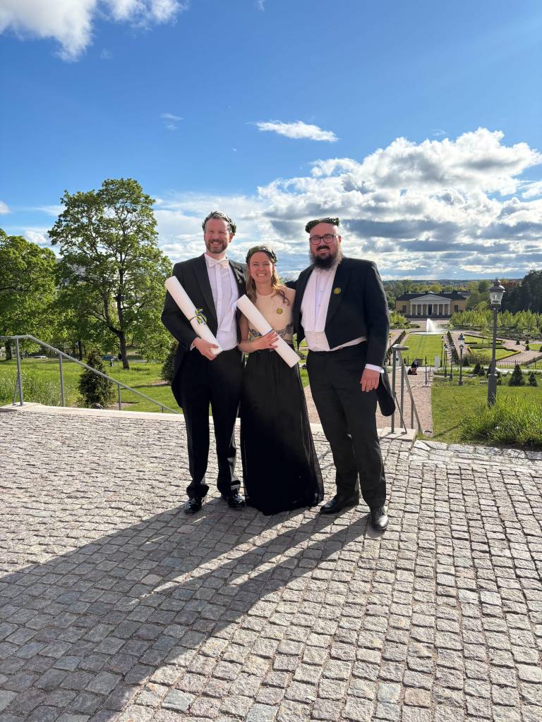 Rickard (right) and Imke (middle) attended the Doctoral Degree Conferment Ceremony of Uppsala University on the 23rd of May 2025. James McKenna (left, PhD graduate in Mattias Jakobsson’s group) also attended the ceremony.